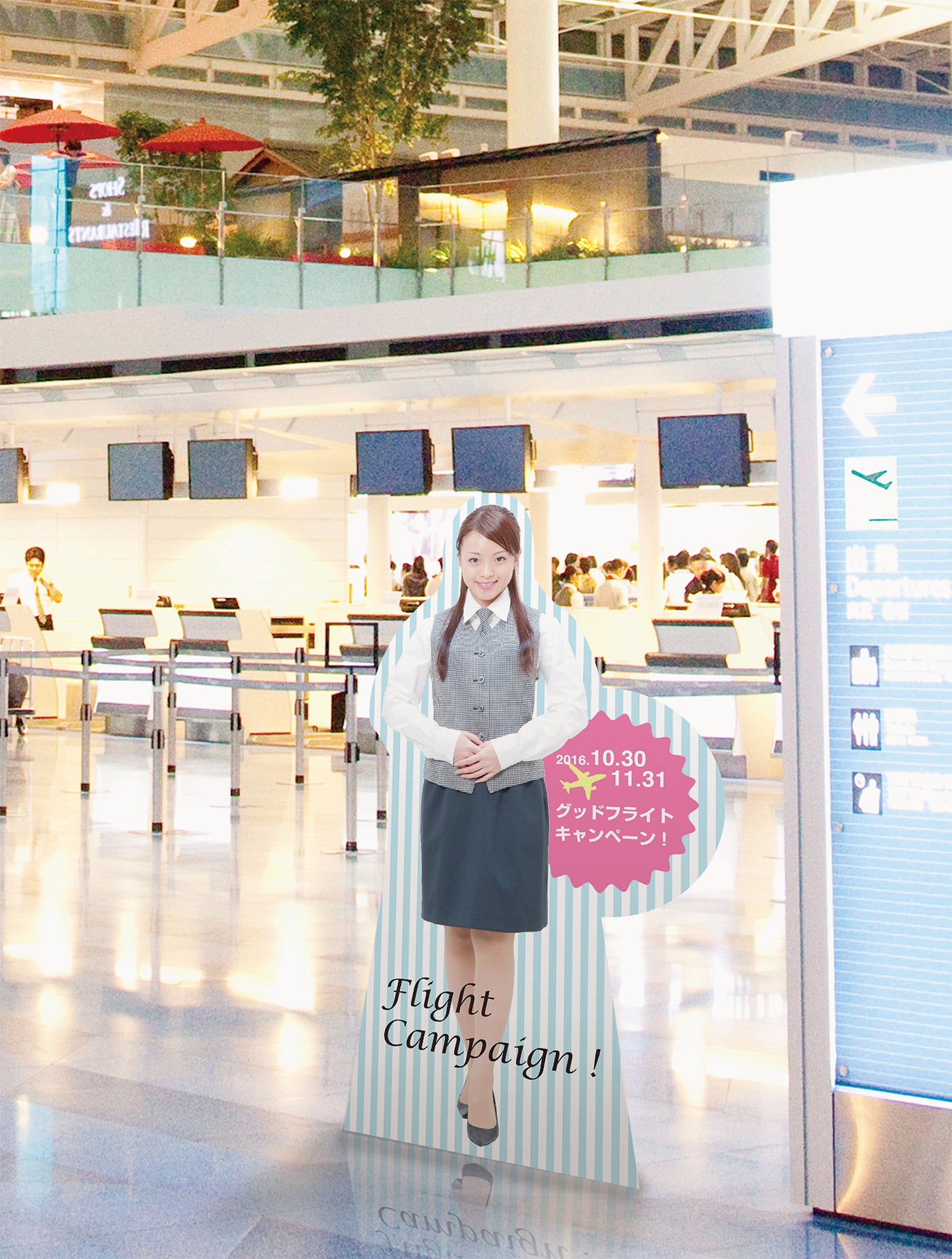 セキュリティゲートカバーや卓上タイプの定番アイテムのほか、人通りの多い場所でも目につくよう等身大パネルを案内板等のそばに配置するなど、様々な用途で幅広くお使いいただけます。